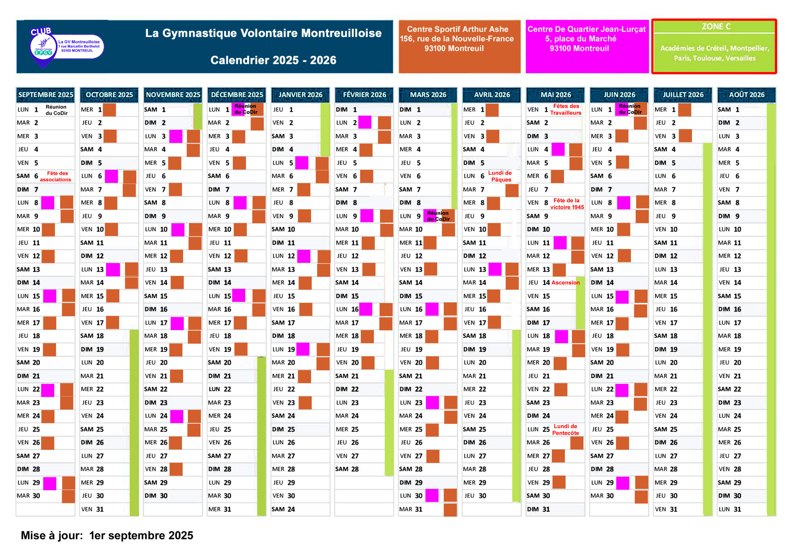 Les séances se déroulent durant l'année scolaire de la zone C hors jours fériés. Tous les cours sont ouverts aux adultes et aux seniors. Les dominantes de l'activité sont décrites afin d'être choisies par les pratiquants en toute connaissance.